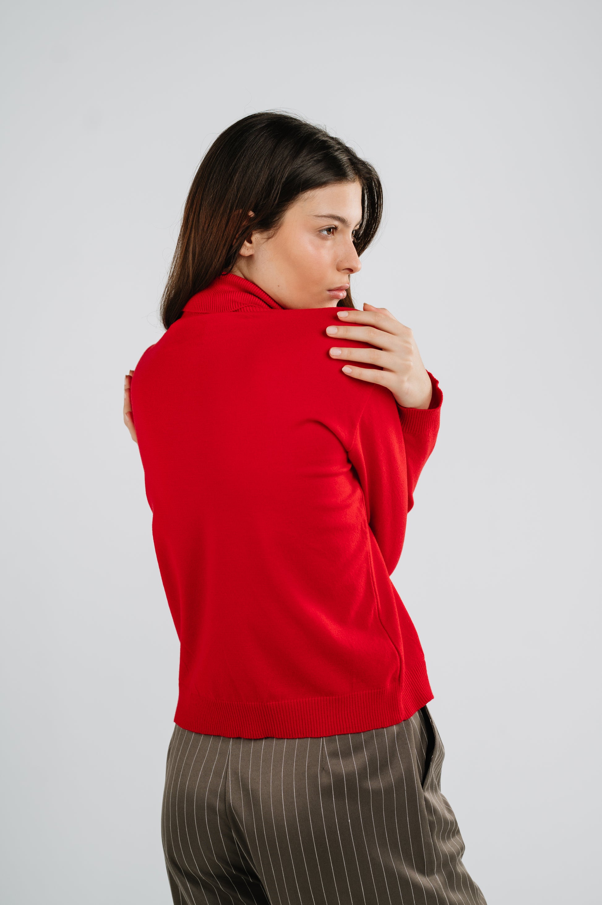 A sleek, elevated take on holiday dressing. The striking red turtleneck sets the tone, while the black Hilda trousers ground the look with soft structure. It’s the perfect choice for Christmas parties, evening plans, or any festive night that calls for subtle sparkle.