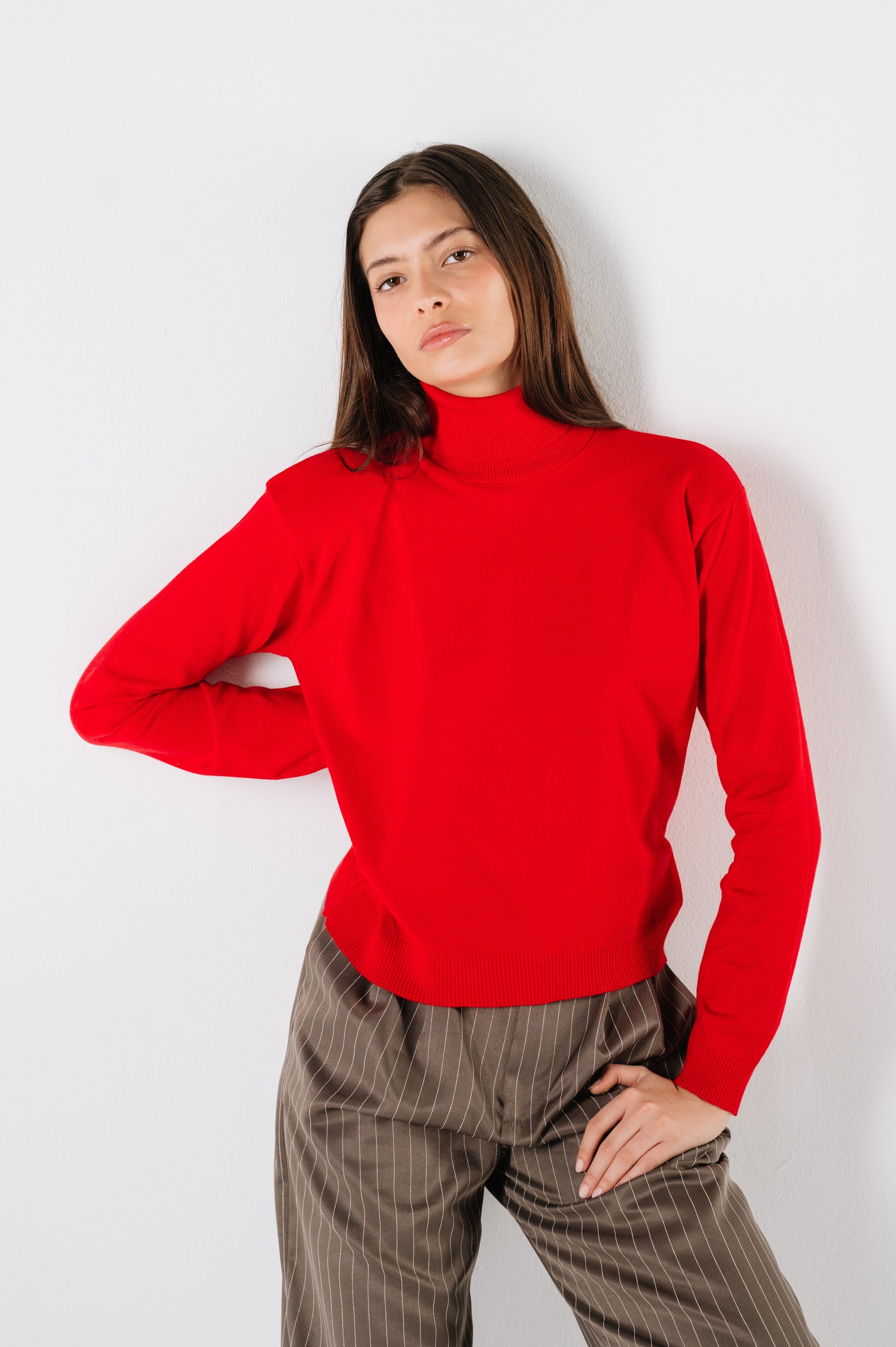 Red turtleneck in an ultra-soft, lightweight knit. Designed with a comfortable fit for effortless winter layering.
