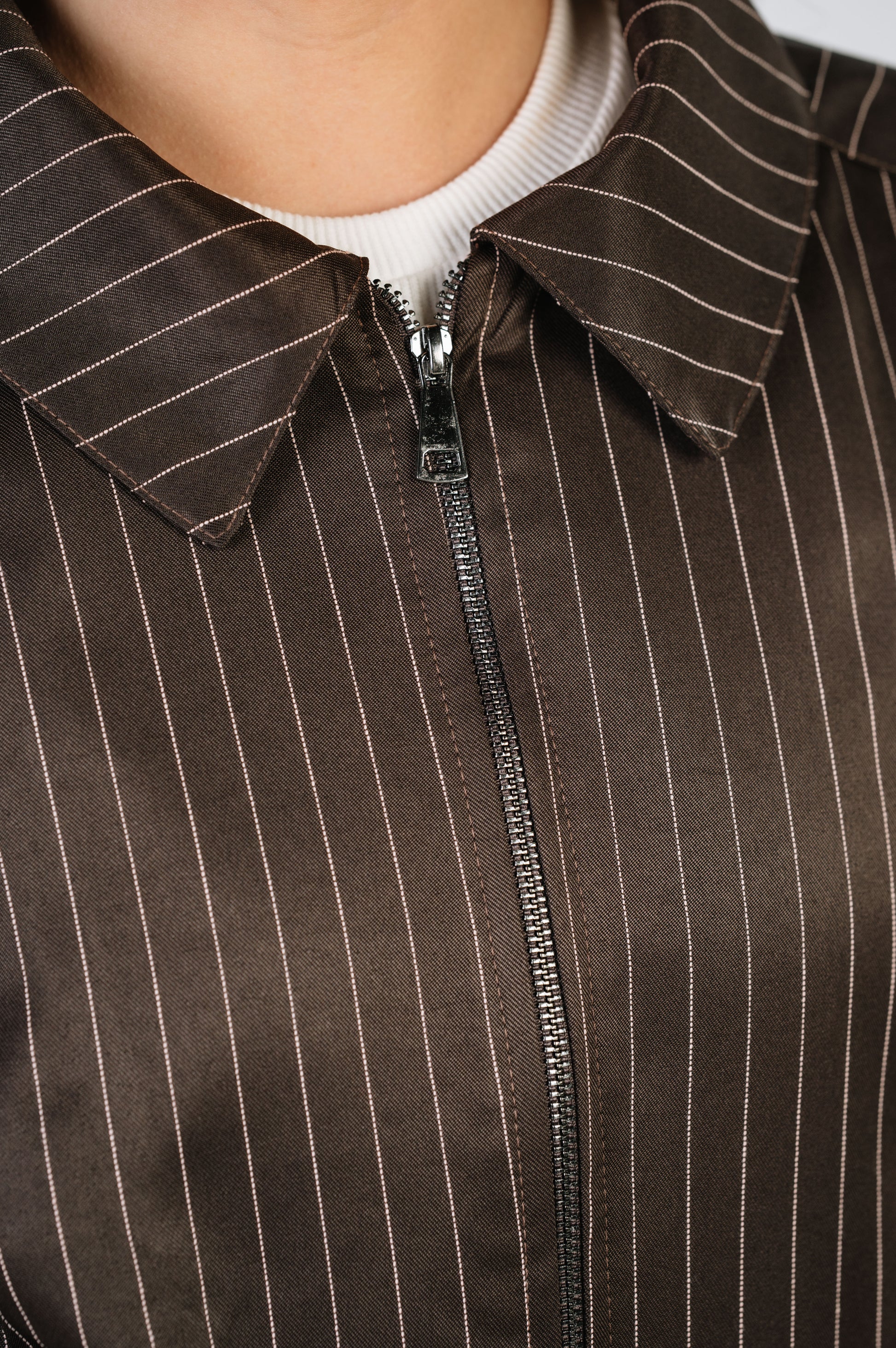 Relaxed pinstripe set with a softly structured silhouette. The jacket features an elastic hem and classic collar; the pants fall straight with an easy, fluid line. A minimal everyday set that feels polished without the effort.